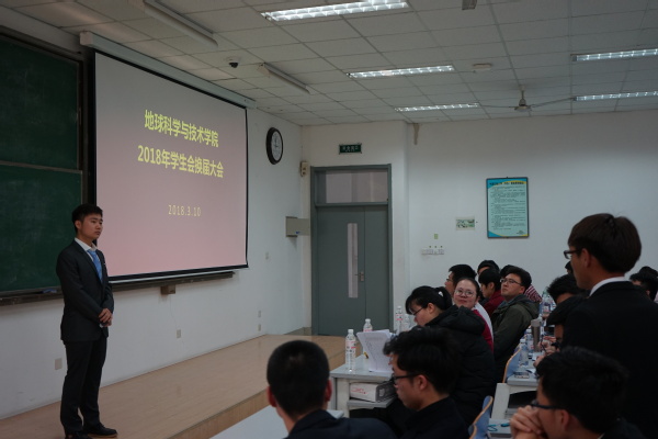 3月10日下午,我院在南教110举行地学院2018年学生会换届大会。党委副书记徐永涛、团委书记霍宁宁、全体辅导员老师、各学生组织主席团成员参加了此次会议并担任评委。