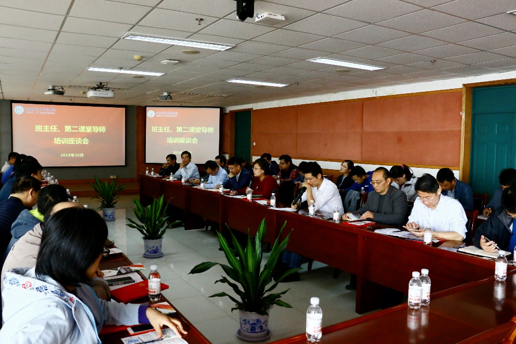 然后,孙鹏燕副处长解读新时代背景下如何更好地开展班主任工作,她强调做好班主任工作根本在于奉献和坚持,能够对学生持之以恒地悦纳、宽容和热爱,帮助他们在学习和生活方面树立目标,奋发进取。石国卿副书记介绍了第二课堂成绩单制度以及“挑战杯”等科技竞赛相关事项,强调了第二课堂对于学生成长成才的重要作用,并希望班主任能在学生的创新创业方面给与指导。学院团委书记霍宁宁解读了学分制改革政策,介绍了学分制下的课程修读和成绩管理细则,帮助班主任和辅导员明确工作内容,更好地指导学生学好理论课程。