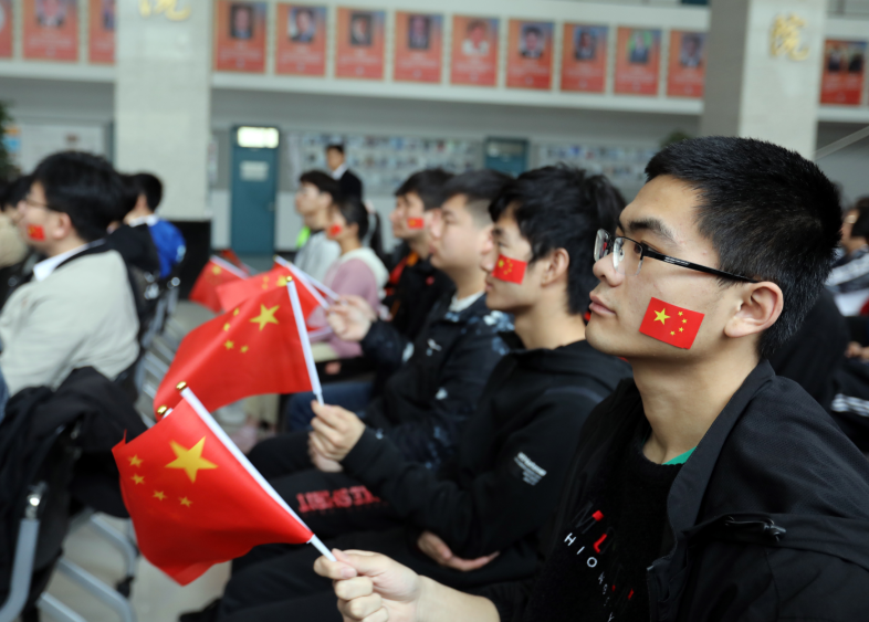 纪念大会直播结束后,在场青年师生舞动手中的红旗,激情诵读《少年中国说》。“少年智则国智,少年强则国强!” 群情激昂的朗读声在C座大厅回响,声声高朗,字字铿锵,道出了青年师生的青春誓言。