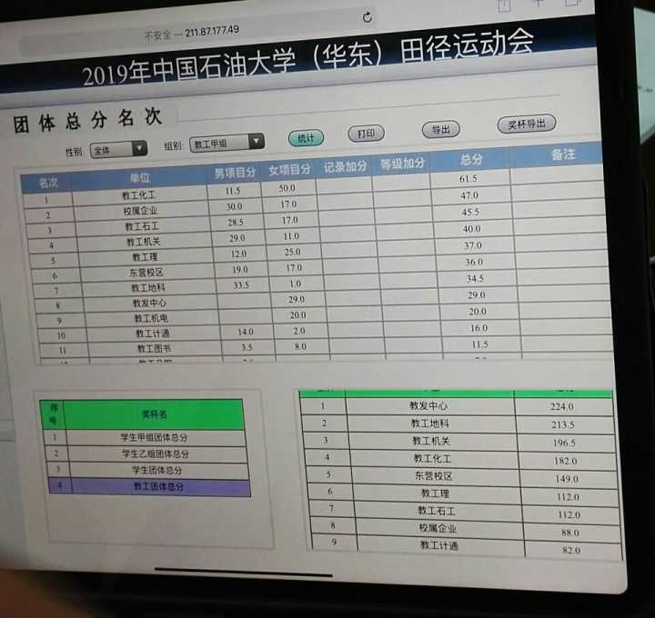 以上是2018年的成绩和今年的成绩。今年理学院和石工分一样,都是112分,理学院冠军多,进了前六。石工有很多理由,多拿一分,在此不做评论。