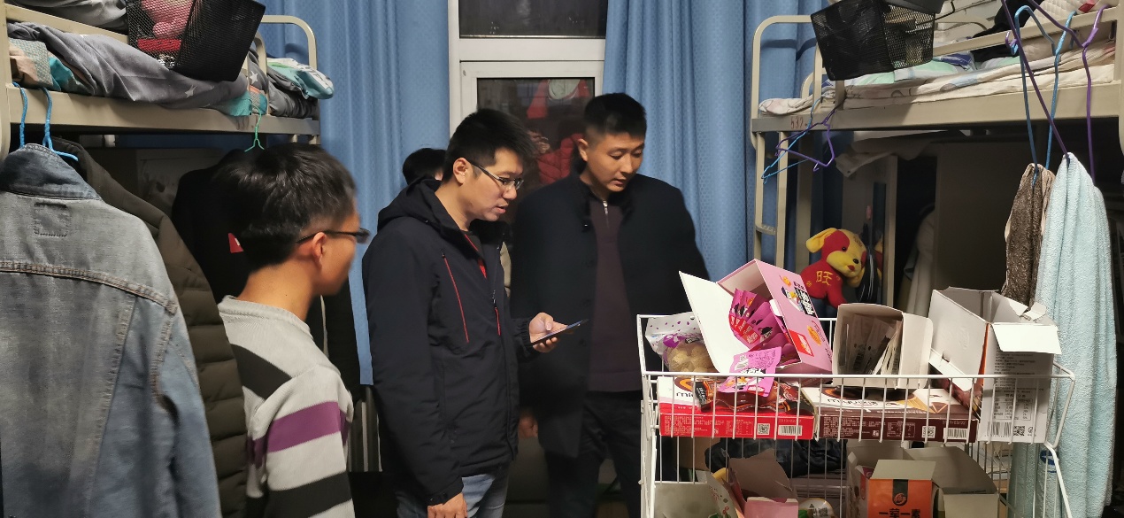 12月5日晚上,学院党委副书记徐永涛带领各年级辅导员进行学生公寓安全专项大检查,从地学院2016级本科生所在的18号公寓开始,此次检查特别邀请了学校公安处消防科科长石鹏飞进行指导,深入学生宿舍一线,对安全状况进行全方位、无死角、地毯式检查,对于存在的安全隐患,采取“零容忍、严处理”的态度。