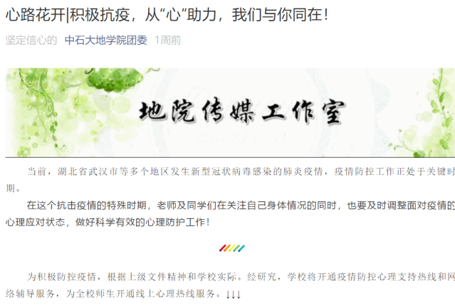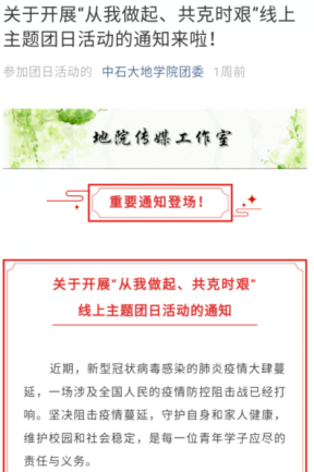 学院团委发布《地学院“从我做起、共克时艰”线上主题团日活动通知》《疫情防控,人人有责——地院学子承诺书》,开通同心战“疫”·我们在行动专栏,微信、QQ空间、易班三大平台同频发声,推送防疫知识,宣传战“疫”正能量,倡导全院学生自主学习、提升自我,坚定信心、做好防护,打赢疫情防控攻坚战。