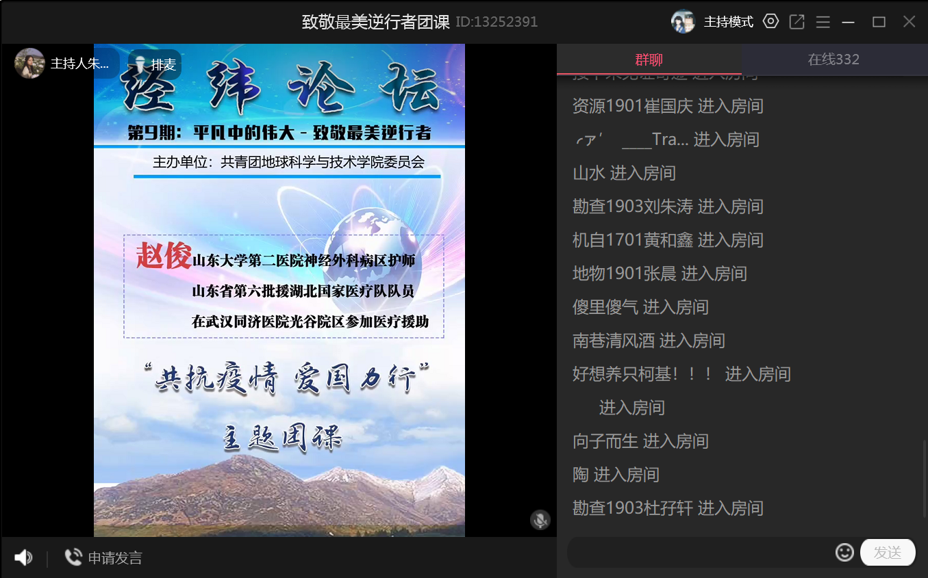 4月18日晚,地学院经纬论坛第九期“平凡中的伟大——致敬最美逆行者”主题团课以线上形式开讲。此次团课由地学院团委主办,学院2018级团总支副书记朱晓剑主持,特邀山东大学第二医院援湖北国家医疗队队员赵俊护师担任嘉宾,面向团学青年分享战“疫”一线的故事。