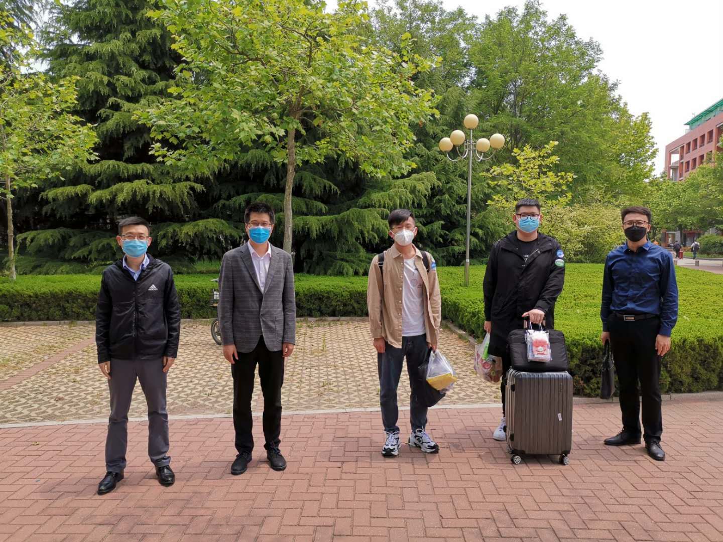 报到现场,返校学生在工作人员的引导下,积极配合身份核验、体温检测、行李消毒等工作。学校为每一名返校同学安排了新冠病毒核酸检测采样,在等待核酸检测结果期间,有辅导员亲自将餐食送到宿舍。采样结束,返校同学领取学校准备的“防疫健康包”,里面包含口罩、体温计、消毒湿巾、防护手册等一应物品,然后沿指定路线回到宿舍楼,整个返校过程井然有序。26日清晨,地物1601班的崔立超进入校门,幸运地成为学院第一个到校的学生,与早早就在门口迎接的领导老师们来了一张珍贵的“会师”合影。