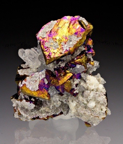 成分与结构:Cu 34. 56%,Fe 30.52%,S 34. 92%。当形成温度高于200℃时,其成分与理想化学式比较,S不足,即(Cu+Fe):S>1。 含有Mn、As、Sb、Ag、Zn、In和Bi等混人物。晶体结构视为两个闪锌矿晶胞叠加,即构成黄铜矿的单位晶胞。每一金属离子(Cu和Fe)的位置均相当于闪锌矿中锌离子的位置,被四个硫离子包围形成四面体配位。而每个硫离子亦被四个金属离子(2Cu + 2Fe)所包围,因此阴阳离子的配位数均为4。所有配位四面体的方位都是相同的。反映在形态上呈四方四面体晶形。