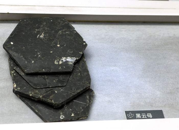 物理性质:褐黑色、 绿黑色乃至黑色:玻璃光泽,解理而显珍珠光泽。{001}解理极完全。薄片具弹性。硬度2-3。密度3.02-3.12g/cm3,因含铁量高,绝缘性差。