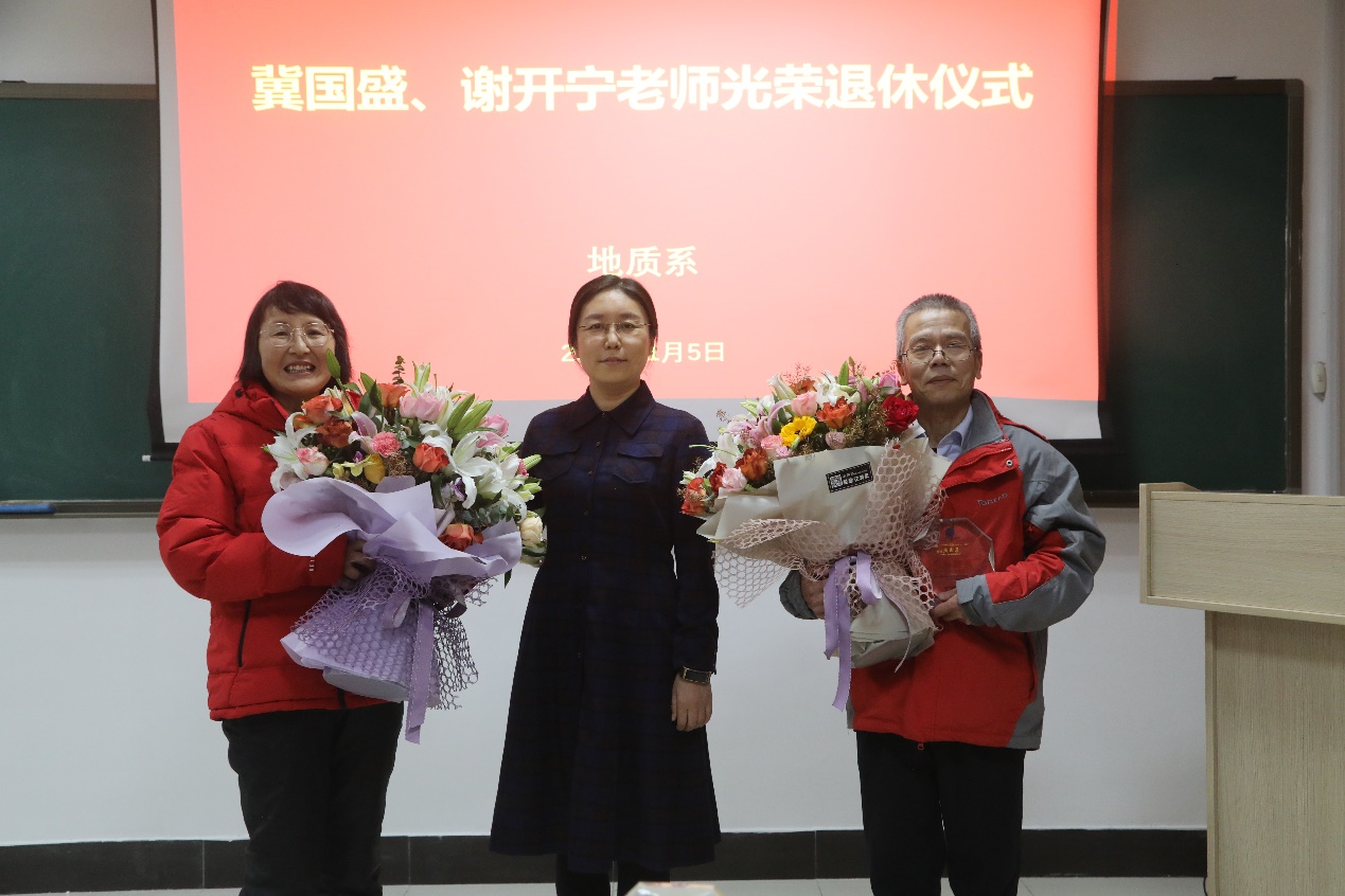 地学院党委书记刘华为冀国盛、谢开宁两位老师颁发退休纪念品