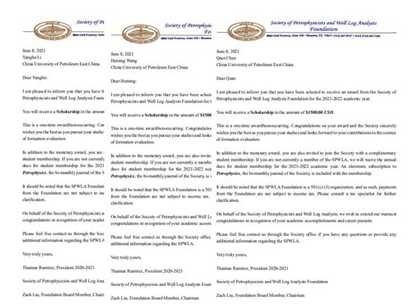 近日,SPWLA(国际岩石物理学家与测井分析家协会)学生奖学金评选结果出炉,我院测井系博士研究生李杨虎、王鹤鸣、陈前3人喜获2021年度SPWLA学生奖学金,奖金为每人1500美元,指导老师为唐晓明教授和张锋教授。据悉,SPWLA奖学金评审委员会每年对来自全球范围的高等院校和科研院所申请者提交的奖学金申请材料进行严格评审,遴选出在测井方法、岩石物理和储层评价等领域取得杰出成果的学生进行奖励。SPWLA奖学金是学生在测井领域获得的国际最高荣誉,标志着我院研究生培养成效获得国际学术界和工业界的认可。
