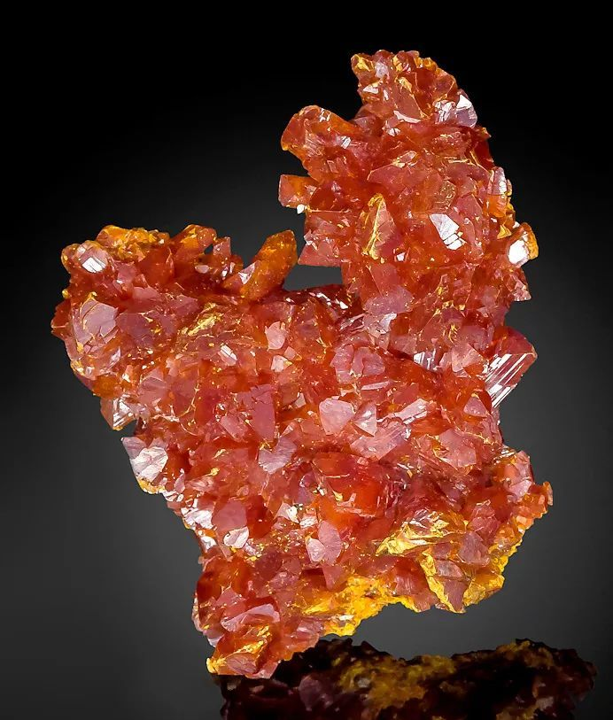 [物理性质]橘红色,条痕淡橘红色;晶面上具金刚光泽,断面上出现树脂光泽,透明至半透明。解理平行{010}完全。硬度1.5-2。相对密度3.6。性脆。长期受光作用,可转变为淡橘红色粉末。