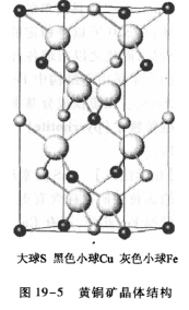 [晶体结构]四方晶系;a0=0.524 nm,c0=1.032nm;Z=4。晶体结构为闪锌矿型结构的衍生结构(图19-5),即其单位晶胞类似于将两个闪锌矿晶胞叠置而成。每一金属离子(Cu2+和Fe2+)的位置均相当于闪锌矿中Zn2+的位置,但由于Zn2+位置被Cu2+和Fe2+两种离子代替并有序分布,使其对称由原闪锌矿结构的等轴晶系下降为四方晶系。高温无序黄铜矿仍保留闪锌矿结构的等轴晶系。