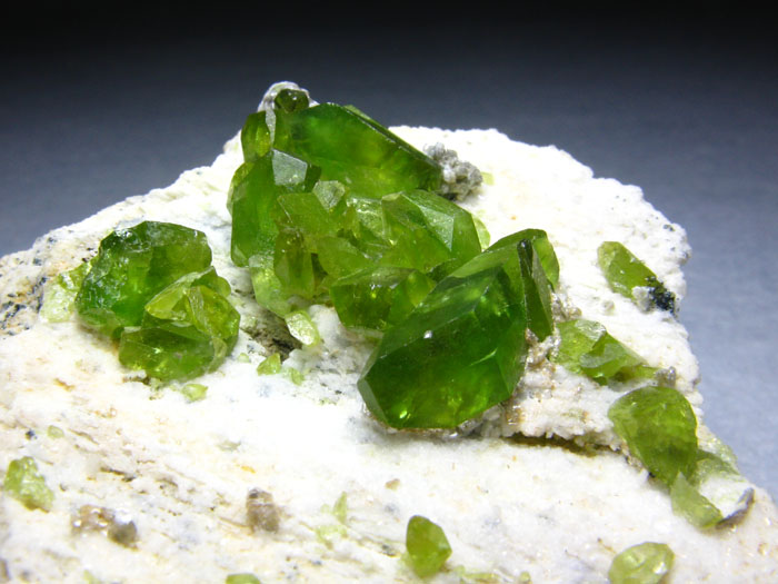 [物理性质]镁橄榄石为白色、淡黄色或淡绿色,随成分中Fe2+含量的增高,颜色加深而成深黄色至墨绿色或黑色,一般的橄榄石为橄榄绿色;玻璃光泽;透明至半透明。解理{010}中等;常见贝壳状断口。硬度6.5-7。相对密度随Fe2+含量的增加而增高(3.27-4.37)。