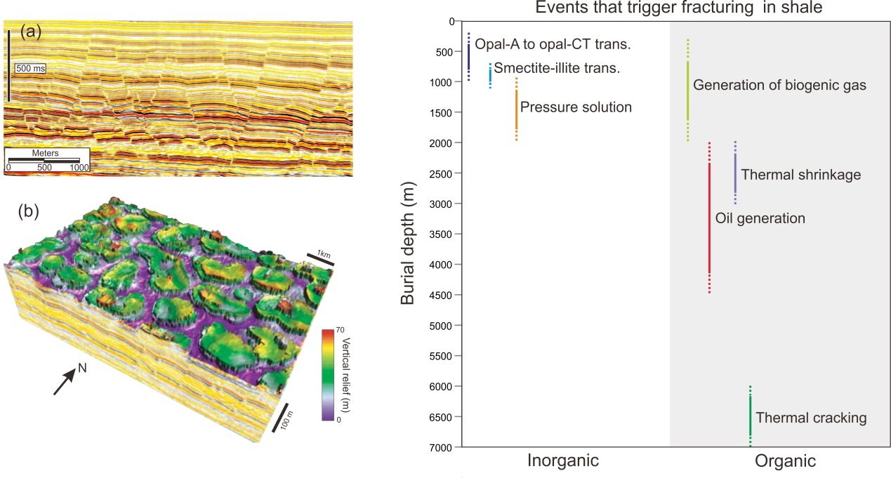 页岩硅质矿物成岩作用导致的差异压实断裂的地震成像(左)及有机/无机矿物协同演化过程中的致裂事件(右)