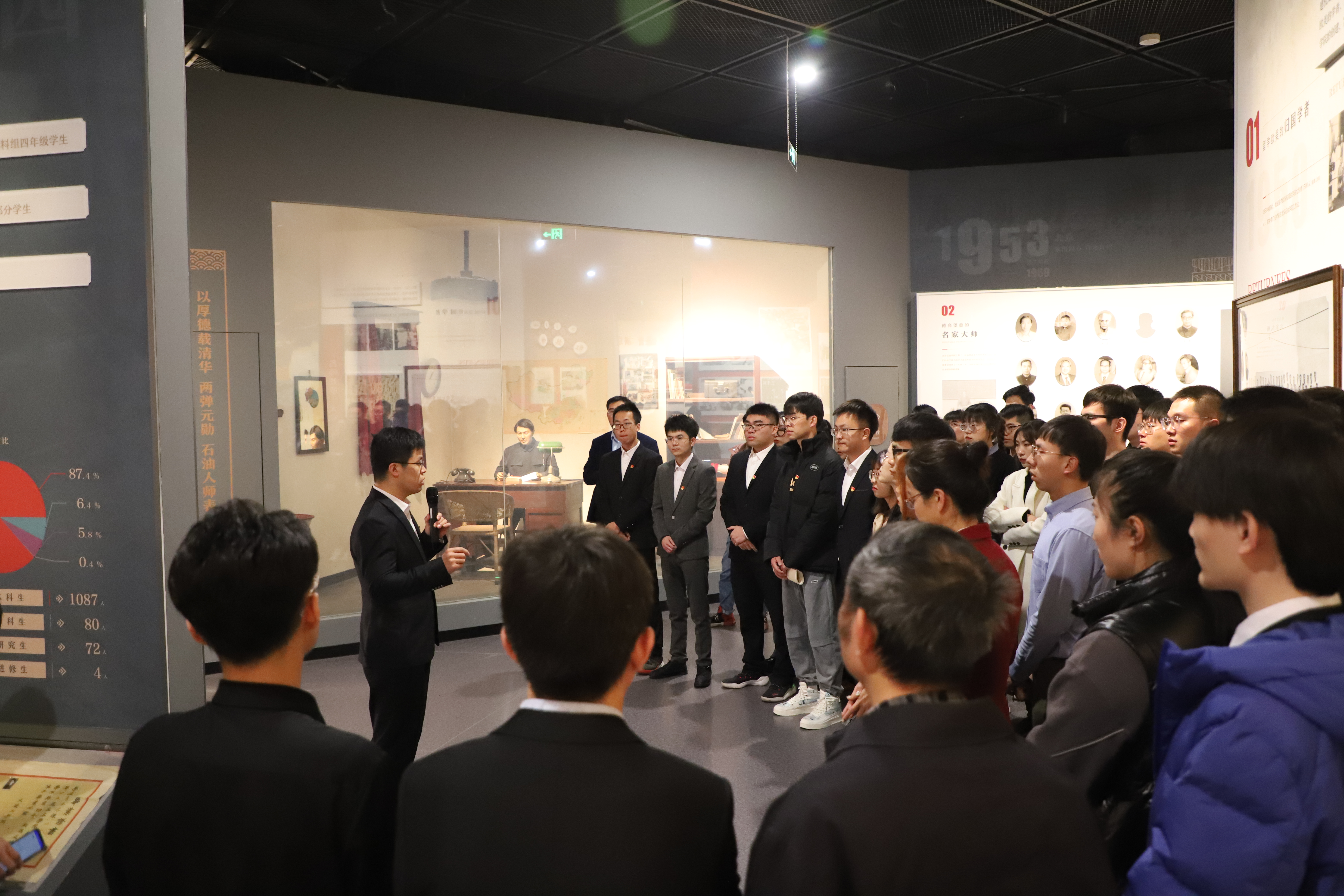 “祖国和人民的利益在期待着你们以高度的热情和毅力,把祖国的石油资源开发出来。”朱德委员长在给北京石油学院学生的回信中表达了对青年学生的殷切期盼。“把爱情献给你,把一生献给祖国。”在学校档案馆留存的中国化学工程学家、核工业学家、两弹功臣、北京石油学院副院长曹本熹写给妻子的150余封信中,字里行间无不流露出对家人的惦念和对祖国石油事业的一片赤诚。“从校园走向荒漠,助推国家第一颗原子弹、氢弹成功爆炸,解决朝鲜战争用油混乱问题,曹本熹的个人事迹化为老一辈石大人为守护国家安全、建设社会主义事业鞠躬尽瘁的一道缩影,石大人用血汗奉献党的光辉历程。”在yL23411永利集团档案馆曹本熹塑像前,全体党员身姿笔挺,表情肃穆,听档案馆教师马梦华深入解读曹本熹先生个人事迹。