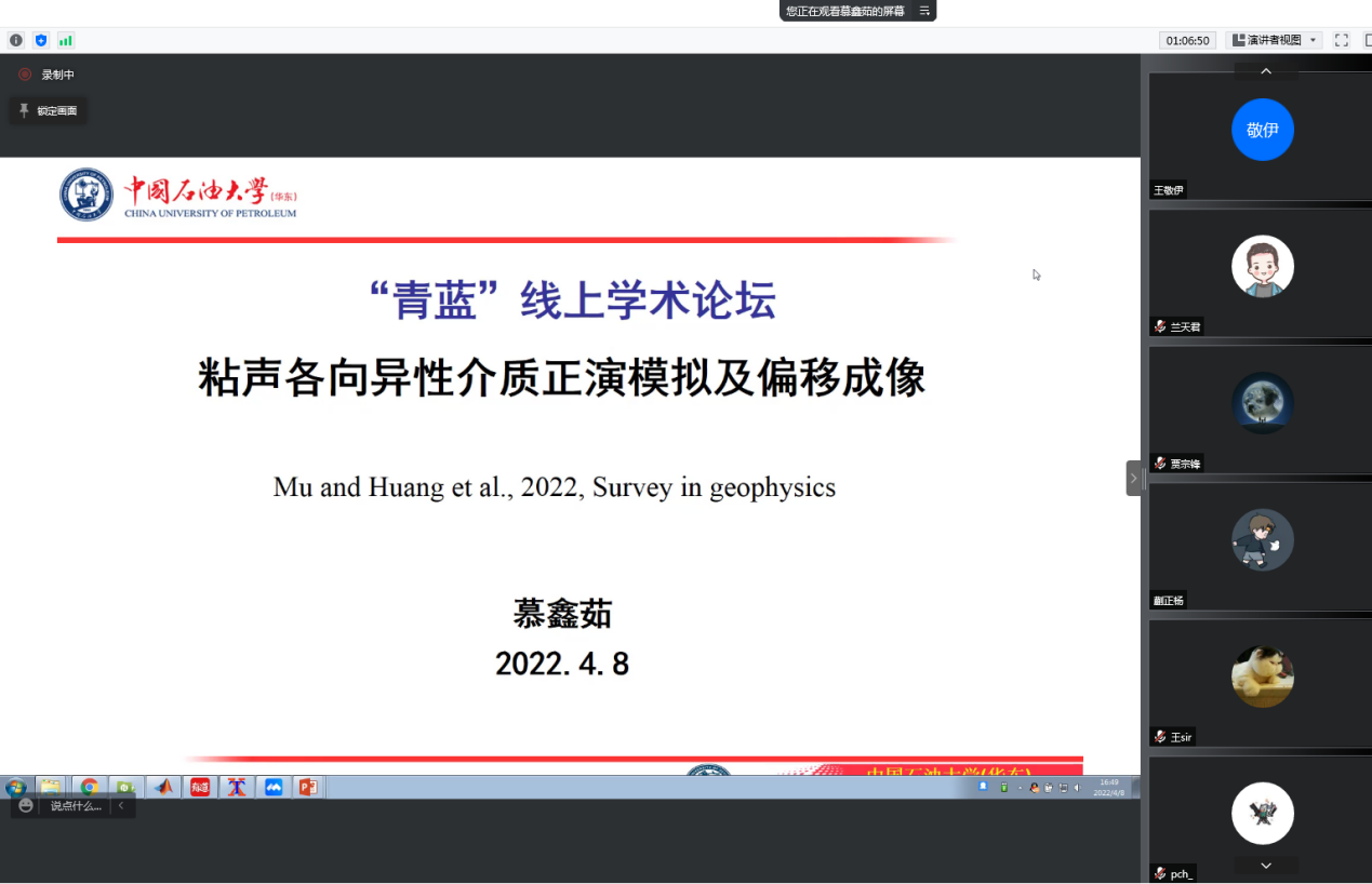 慕鑫茹博士做“粘滞性及各向异性介质中地震波正演模拟及偏移成像”的学术报告