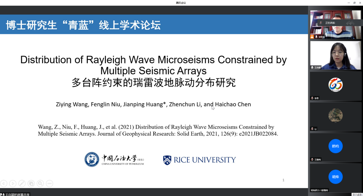 本期论坛首先邀请王自颖博士做了“多台阵约束的瑞雷波地脉动分布研究”的报告,报告以地球背景噪声中能量最强的地脉动为研究对象,利用中国东部郯庐断裂潍坊段的密集台阵联合美国加州台网数据,采用台阵聚束分析与噪声互相关方法,观测地脉动的季节性变化和方位分布特征,并基于多台阵反投影技术,约束地脉动震源区,在全球尺度定位瑞雷波地脉动,得到强振幅且持续的地脉动震源。该研究于2021年发表于美国地球物理联合会(AGU)出版的地球科学领域国际权威期刊《JGR:Solid Earth》,该期刊同时也是自然指数(Nature Index)选取的世界一流科研期刊之一。随后,慕鑫茹博士做了“粘滞性及各向异性介质中地震波正演模拟及偏移成像”的报告,报告以西部地区复杂地下介质广泛发育粘滞性及各向异性特性为研究对象。从地震波传播机理出发,研发了准确、稳健、高效的粘滞性及各向异性介质中地震波传播方程。并基于解析解理论,发展了一种稳定的衰减补偿延拓算子,最终实现了稳定高效的粘滞性及各向异性介质偏移成像。两位博士在精彩的学术报告之后分别就现场的提问进行了细致的解答,参与交流的师生踊跃发言、讨论热烈。地学院分论坛首场报告的成功举办拉开了一场为期4个月的学术交流盛会,每周五下午4:00-6:00的两场学术报告、 32位优秀博士生将共同为全院师生带来一场场精彩纷呈的学术盛宴。