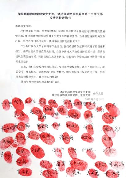 资源专业本科生党支部、储层地球物理实验室党支部、储层地球物理实验室博士生党支部、地物专业本科生党支部等支部纷纷签署《疫情防控请战书》,发出了“我是党员我带头”,“我是党员我先上”的最强音,为后续志愿服务工作开展打好了坚实的基础。