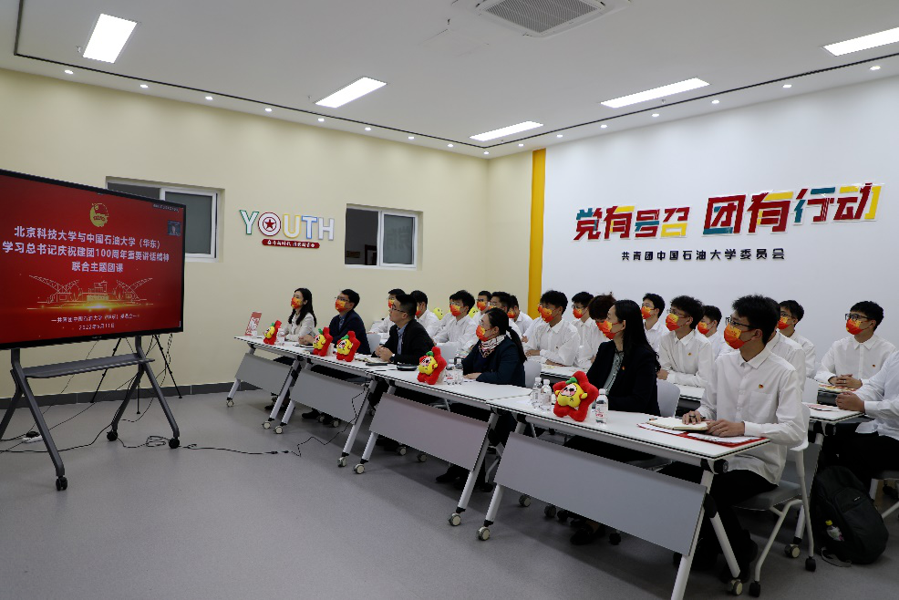 为庆祝中国共产主义青年团成立100周年,引导广大团员青年深入学习领会习近平总书记庆祝建团100周年重要讲话精神,5月11日下午,我校与北京科技大学联合举办“学习总书记庆祝建团100周年重要讲话精神”主题团课。北京科技大学团委书记王鹂、副书记于林民,我校团委副书记姜士绅、组织部部长刘秋蘅,学院党委副书记郑珊珊、团委书记王力禾参加团课,我院资源勘查工程2001团支部、本研一体(油气资源类)2001团支部成员现场参加团课学习。