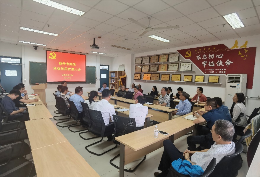 随后,支部讨论接收杨升宇同志为中共预备党员的议题。杨升宇同志汇报了其对党的认识和入党动机。他将自己的入党历程分为“心之所向、失之交臂”、“心之所向、翘首已盼”和“心之所向、身之所往”三个阶段,表明他的入党动机不仅包括对党的宗旨理论的高度认可,也包括了对党给国家人民和自身带来幸福生活的感激。然后,张立强和王广伟老师作为入党介绍人,分别对杨升宇同志的有关情况和入党意见进行了说明。张立强表示,杨升宇同志自向党组织提交申请以来,一直以党员标准严格要求自己,积极参加各项党组织活动,认真学习党的理论,切实将习近平新时代中国特色社会主义思想落实到教育教学和科研实践当中,为学校、学院做出了突出贡献。王广伟表示,杨升宇同志自2020年入校来,积极学习党的理论和方针政策,政治立场坚定,在青年教师线上课程观摩、运动会和日常公共事务方面都起到了模范带头作用。与会党员进行了充分讨论。张卫海对杨升宇同志入职以来热爱学院,热切为大家做贡献的行为表示认可;杨少春指出,杨升宇同志无论本职工作还是科研学术方面都有很大潜力;国景星表示,杨升宇同志入党愿望强烈,工作上积极创新,为学校学院服务的态度积极。张世奇、徐守余和冯子齐等老师分别表达了自己的看法,一致认为杨升宇同志满足预备党员的要求。最后,经过表决,一致同意接收杨升宇同志为中共预备党员,并提交学院党委审批。