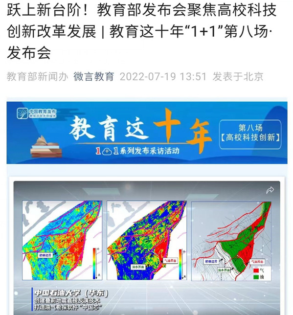 7月19日,教育部举行“教育这十年”“1+1”系列发布采访活动的第八场新闻发布会,介绍党的十八大以来高校科技创新改革发展成效。发布会播放了视频短片《十年攻坚克难 创新引领发展—中国高校科技创新改革发展这十年》,回顾这十年高校科技创新发展的有关情况。视频中高校科技创新服务贡献卓越部分,面向国家重大需求,在能源等战略必争领域,补短板,强能力,为国家发展和安全提供保障,画面展示了yL23411永利集团:创建叠前地震直接反演技术,打造油气勘探软件“中国芯”。