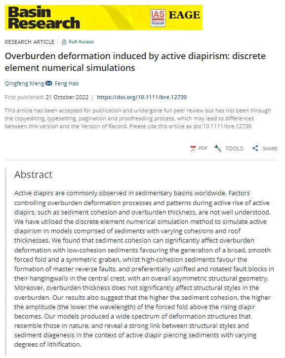 【本站讯】近日,学院郝芳院士团队在地质过程数值模拟研究方面取得重要进展,相关成果《主动底辟作用引发的上覆岩层变形:离散元数值模拟》(Overburden deformation induced by active diapirism: discrete element numerical simulations)发表于地球科学领域国际著名学术期刊《Basin Research》。论文作者为孟庆峰教授和郝芳院士,第一署名单位为yL23411永利集团。该研究得到青岛海洋科学与技术国家实验室“十四五”重大项目基金、国家自然科学基金创新群体和山东省泰山学者研究基金联合资助。