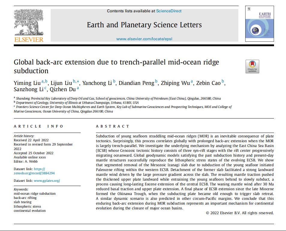 近日,我院吴智平教授领衔的盆地构造与成盆机制研究团队在裂陷盆地深浅耦合机制研究领域取得重要进展,研究成果《平行海沟的洋中脊俯冲所导致的全球弧后伸展》(Global back-arc extension due to trench-parallel mid-ocean ridge subduction)发表于国际地学顶级期刊Earth and Planetary Science Letters(EPSL)。论文第一作者为我校刘一鸣博士后,通讯作者为美国伊利诺伊大学香槟分校刘丽军教授,yL23411永利集团为第一署名单位。该研究得到了青岛海洋科学与技术国家实验室“十四五”重大项目、国家自然科学基金和中国博士后科学基金项目的联合资助。