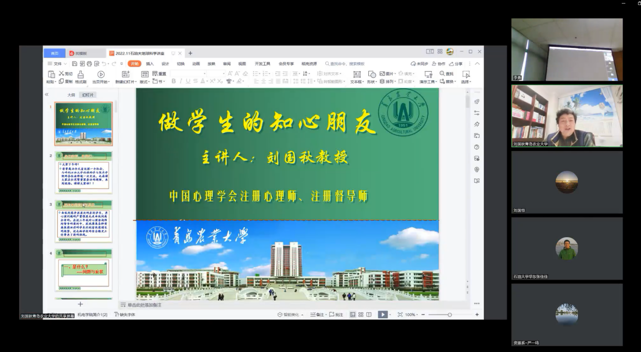 11月27日下午,2022石大师说系列导师沙龙第44期在我院成功举办,本期沙龙特邀请原中国心理卫生协会大学生心理咨询专业委员会委员,原青岛农业大学党委副书记刘国秋教授做了“做学生的知心朋友”专题心理报告。由于疫情原因,会议采用线上形式进行,由宗兆云副院长主持,学院2022年新晋研究生导师和其他导师共同参会。