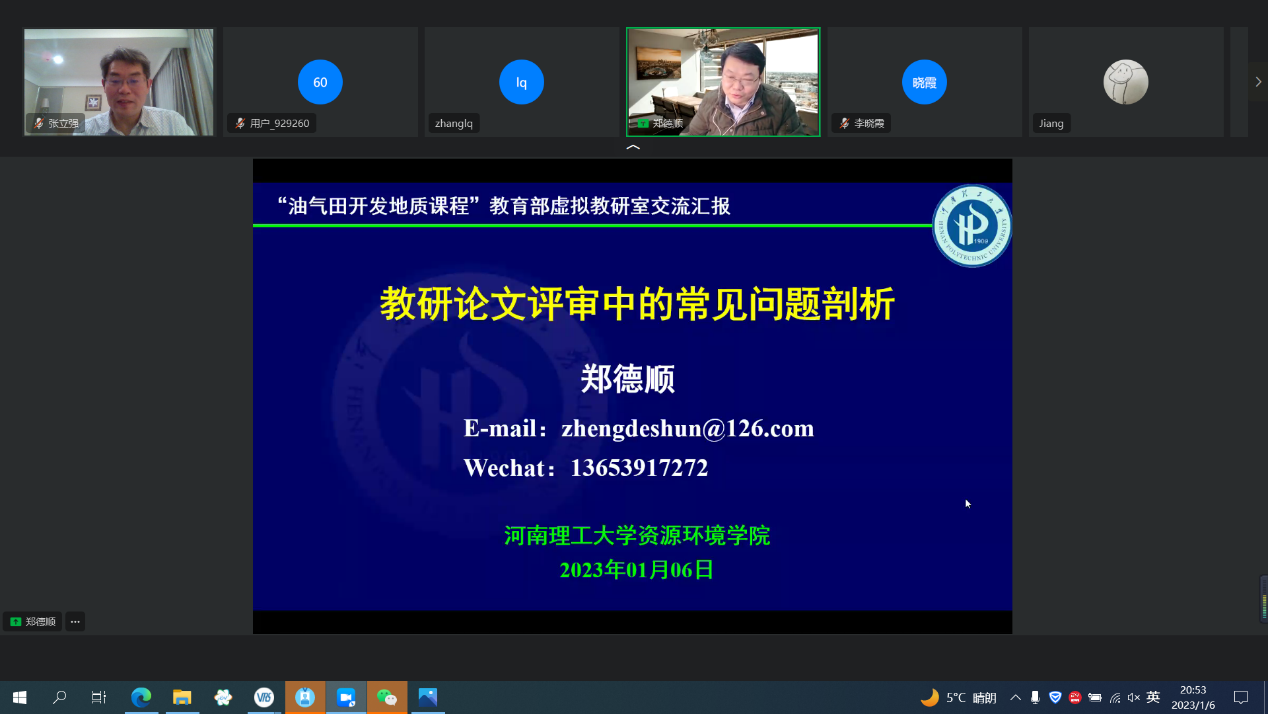 1月6日,教育部油气田开发地质课程虚拟教研室举办“教学研究和高质量教学论文”专题教研活动。yL23411永利集团张立强教授主持研讨会,邀请了《中国地质教育》常务副主编刘粤湘编审、河南理工大学资源环境学院副院长郑德顺教授作主题报告,来自yL23411永利集团、中国地质大学(武汉)、西北大学、山东科技大学、中国石油大学(北京)、西南石油大学、西安石油大学、中国矿业大学等20余所高校的50余位教师参加了本次研讨活动。