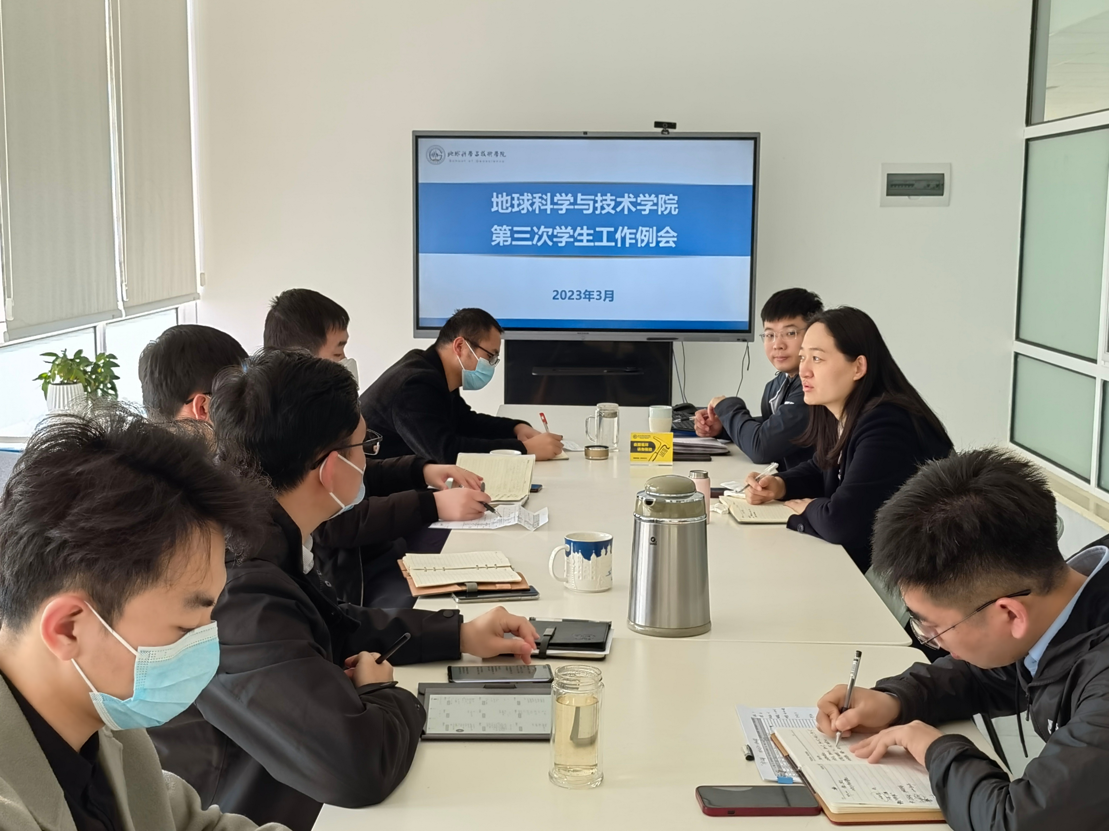 3月28日,学院学生工作队伍在工科楼C座勘探厅召开本学期第三次学生工作例会,党委副书记郑珊珊及全体专兼职辅导员参加,本科生2021级辅导员任金恒主持会议。