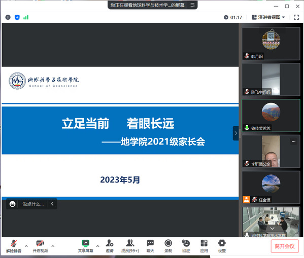 任金恒向家长介绍了石油行业现状、学院学科建设、师资配备和人才培养等情况。他提到:“油气在未来很长一段时间依然是世界主体能源,有广阔的发展空间。地学院具有多个重点学科和硕博士点,师资力量雄厚,依托“一流学科”平台,学生可以享优质的教育资源,提高自身专业技能。”随后,他重点介绍了推荐免试研究生政策、创新创业竞赛、学业成绩、防骗反诈等方面的内容。他提到,专业知识是立身之本,学生只有取得良好的学业成绩,才能掌握主动权和选择权。
