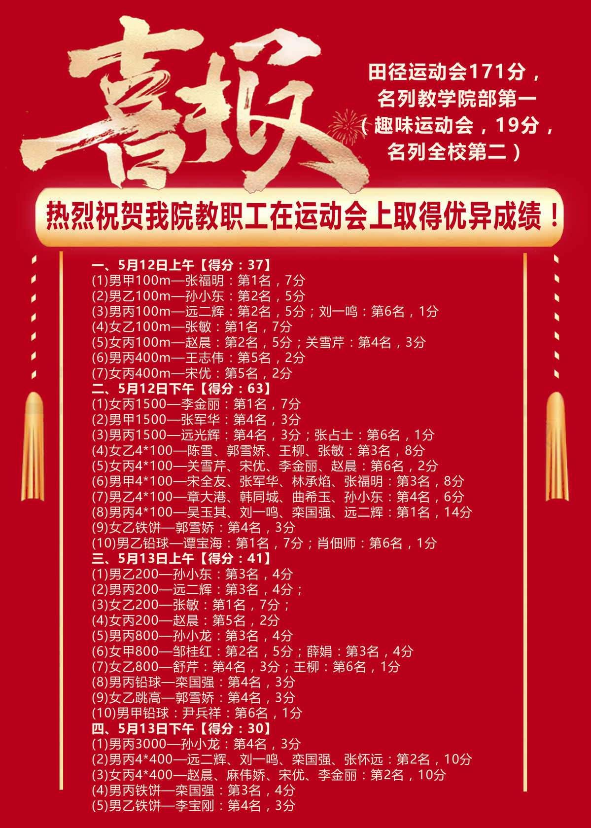 今年教职工田径运动会,得分171分,依然傲视各大院,取得辉煌战绩,成绩可喜可贺!