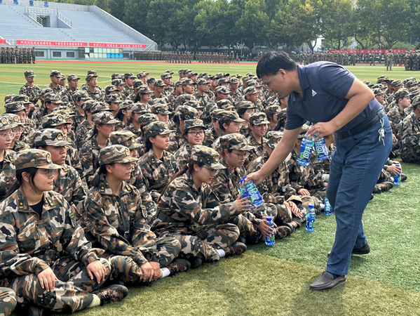 随后,赵放辉和到场老师对同学们的身体健康进行了关心和询问,为同学们分发了饮料,并叮嘱同学们注意防晒,注意休息,遇到困难及时和教官和辅导员老师沟通。