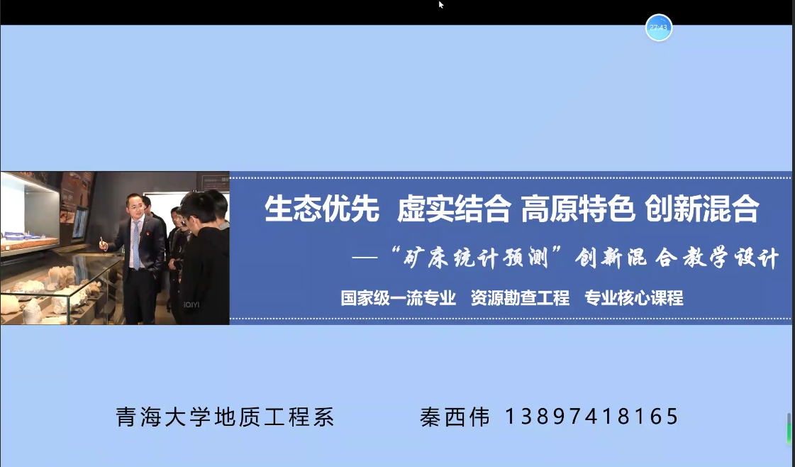 青海大学秦西伟副教授作题为《"矿床统计预测"创新混合教学设计》,他从课程概况、过程方法、理念思路、课程特色、学情痛点和成效推广几个方面系统深入介绍了青海大学国家级一流专业—资源勘查工程的核心专业课程。在教学创新思路方面,秦西伟老师重点介绍了教学内容、环境重构;教学模式创设;思政体系、路径构建;评价机制构建等途径。在过程方法方面,秦西伟老师强调了混合教学内容,创设混合式教学环境、创设混合式教学模式、构建课程思政体系,探索课程思政实施路径,以及构建融合式评价机制。在课程特色方面,秦西伟老师所在教学团队强化案例式教学,以案促教、以案促学,打造具有高原特色的野外矿山案例库;优化“五维”课程思政体系,创新课程思政教学方法和实践路径,深度融合高原特色思政元素;创设具有地矿特色的“线上与线下、室内野外、虚拟现实”相结合的混合式教学环境,设计“人文思政、问题驱动、虚实结合、矿例导入、原位翻转”创新混合教学模式。