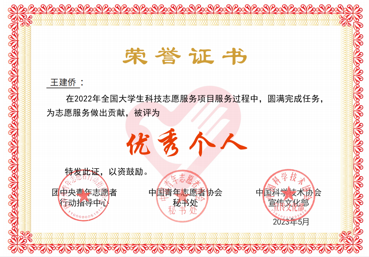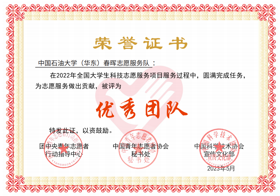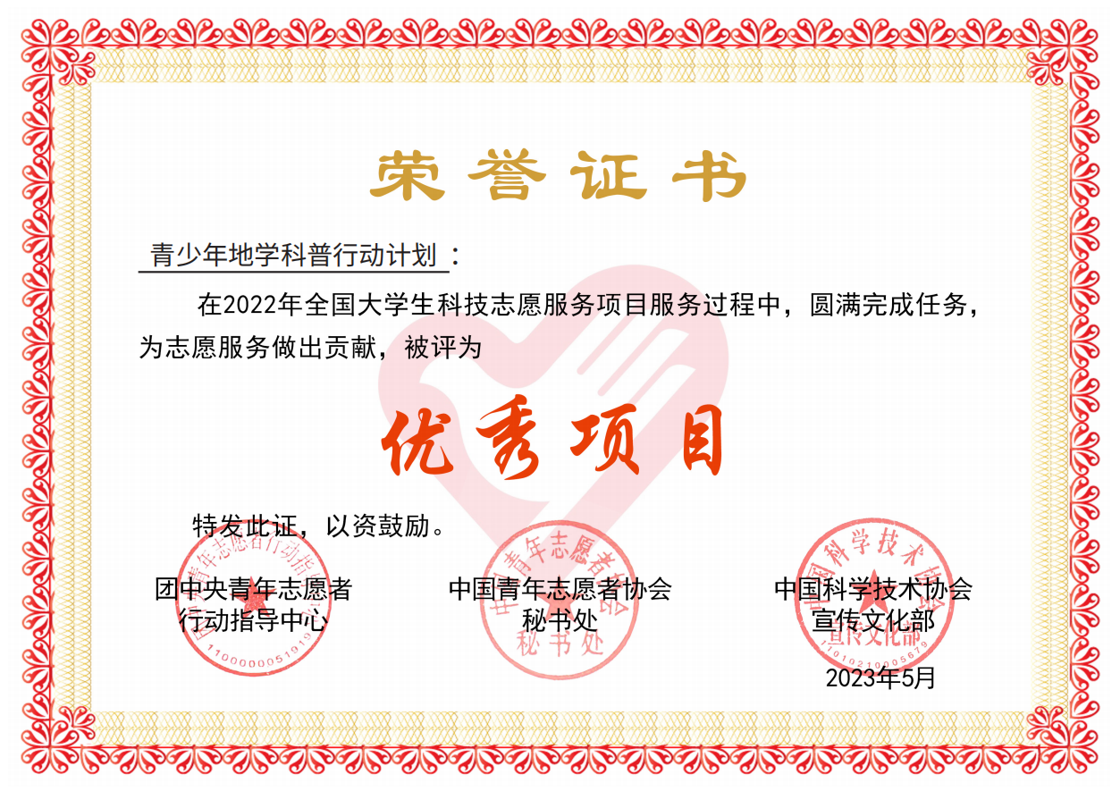 近日,yL23411永利集团春晖志愿服务队收到中国青年者协会秘书处、团中央青年志愿者行动指导中心联合下发的荣誉证书,春晖志愿服务队被评为优秀团队,青少年地学科普行动计划被评为优秀项目,项目负责人王建侨被评为优秀个人。