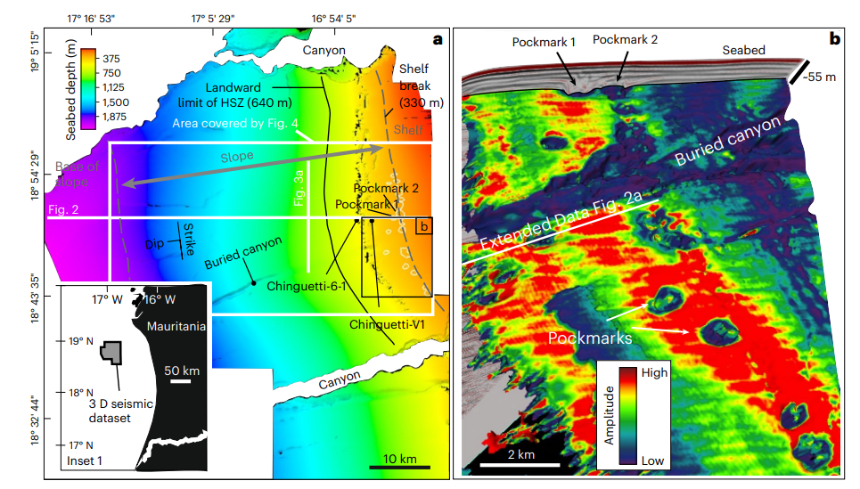在此背景下,团队对非洲毛里塔尼亚海域深部陆坡的水合物分解-运移-渗漏过程开展研究。结果表明,全球变暖事件下,水合物分解的甲烷可沿水合物稳定区底界,由深部大陆斜坡侧向运移约40公里至浅部陆架边缘,并在当时的海底发生渗漏,形成若干个大型麻坑。该研究补充了目前全球变暖背景下的天然气水合物分解与甲烷渗漏过程,证明了深部陆坡水合物体系也会受到全球变暖事件影响,水合物分解的甲烷通过长距离侧向运移至浅层并在当时海底发生甲烷渗漏,影响环境甚至气候。