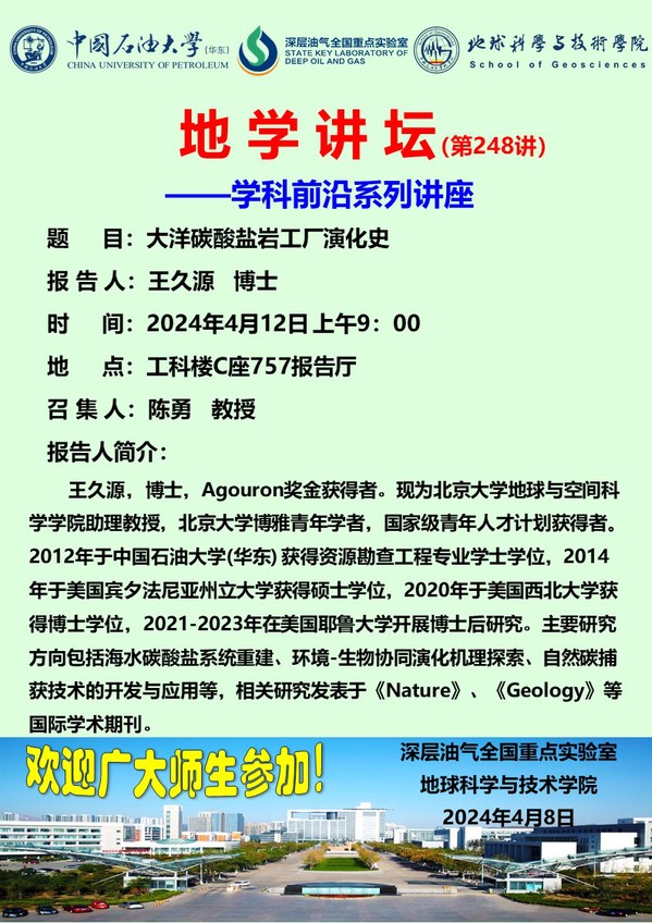 【地学讲坛第248讲】关于王久源博士学术报告的通知