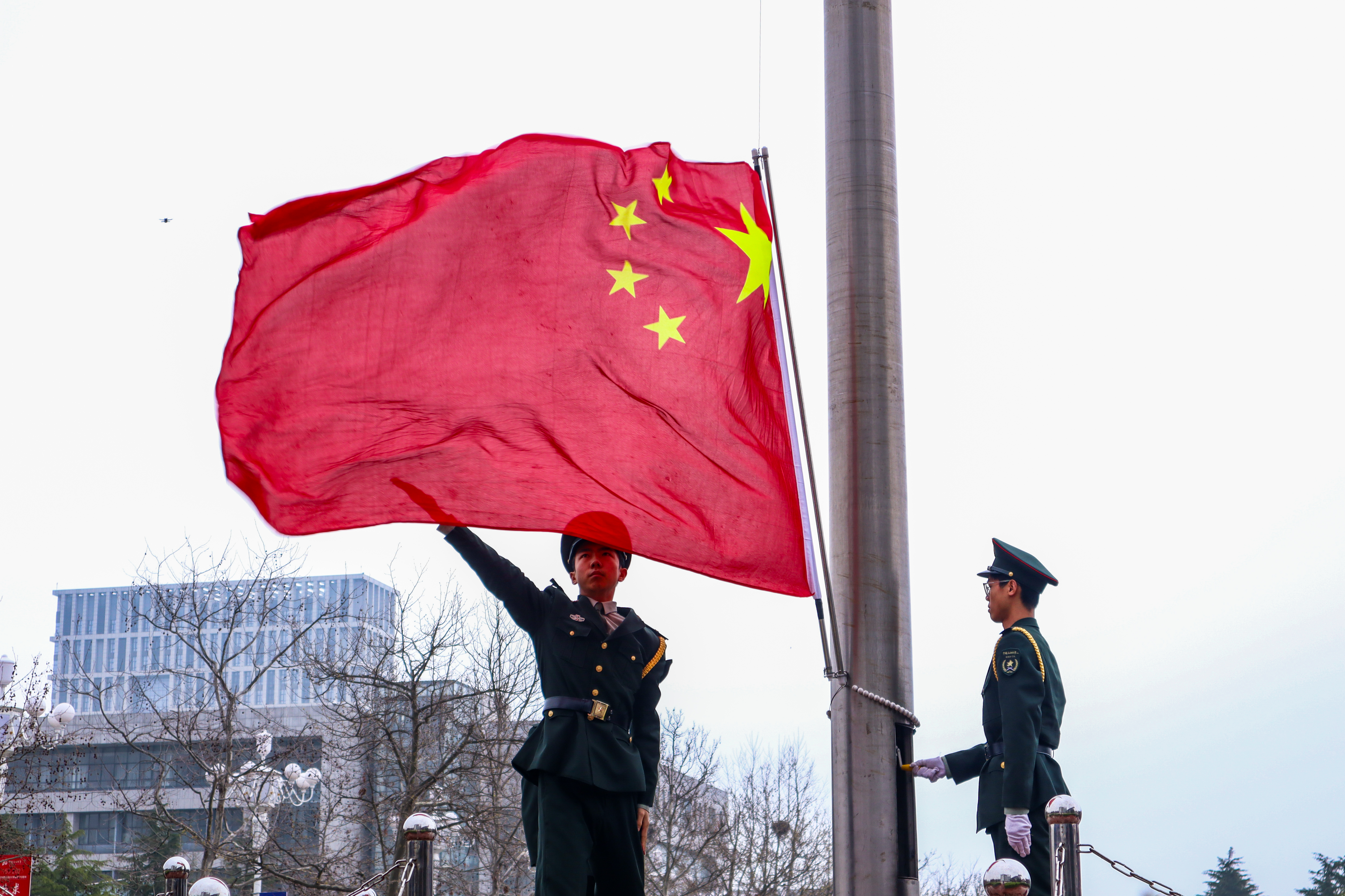 清晨,曙光初照,子元广场庄严肃穆。随着《义勇军进行曲》雄壮激昂的旋律响起,青年师生齐声高唱国歌,鲜艳的五星红旗在晨光中冉冉升起,象征着中华民族的伟大复兴与繁荣富强。