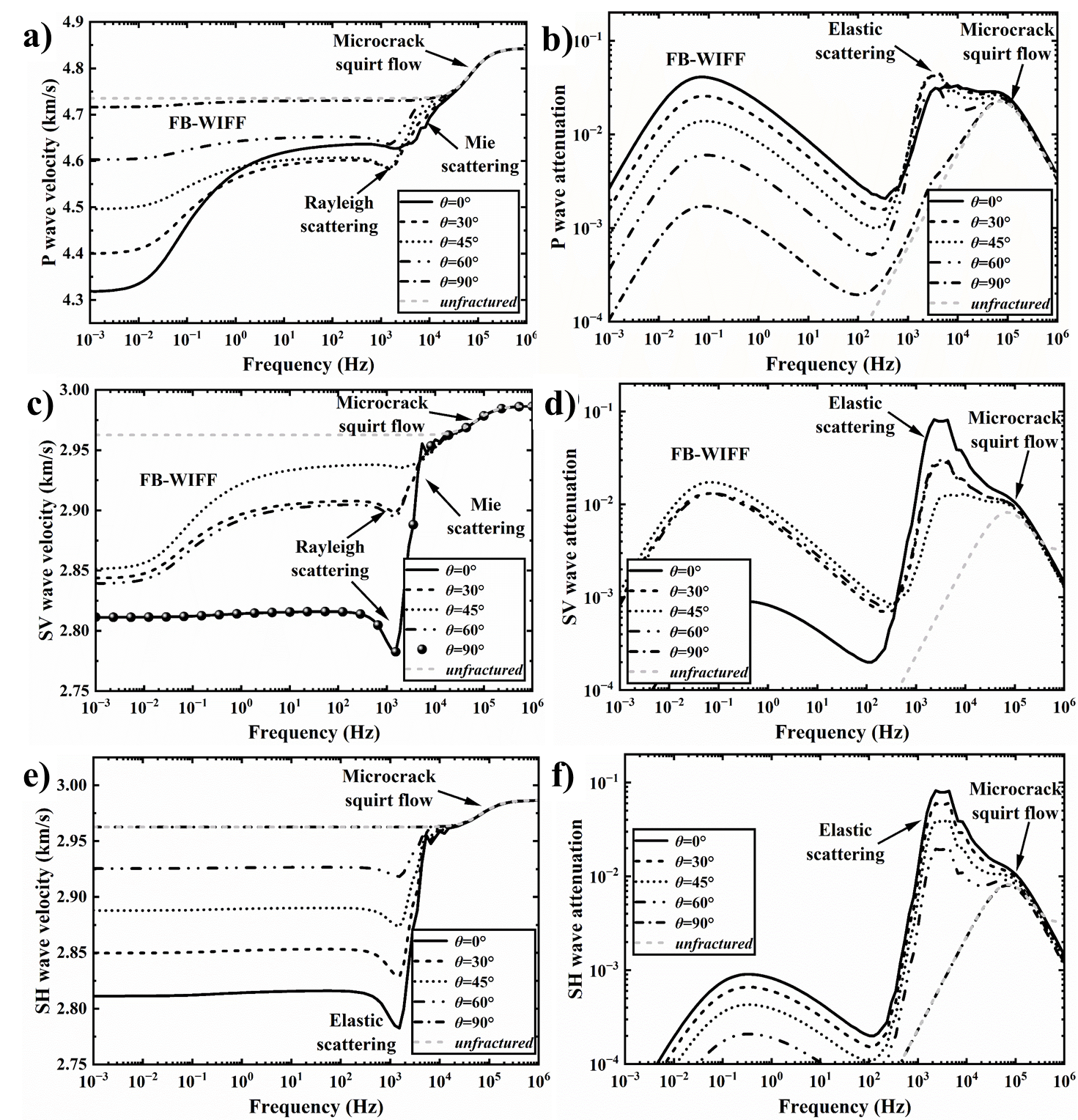 图2.含多尺度裂缝诱发各向异性岩石P波、SV横波和SH横波的速度频散和衰减