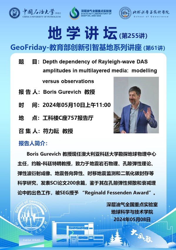 【地学讲坛第255讲】关于Boris Gurevich 教授《Depth dependency of Rayleigh-wave DAS amplitudes in multilayered media: modelling versus observations》学术报告的通知