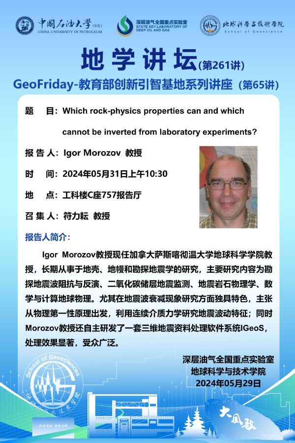 【地学讲坛第261讲】关于Igor Morozov 教授《Which rock-physics properties can and which cannot be inverted from laboratory experiments?》学术报告的通知