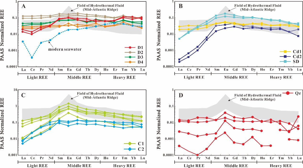 近年来,热液白云岩(Hydrothermal dolomite,简称HTD)因其潜在的油气储集能力受到全球学者的广泛关注,世界范围内已发现了许多与热液作用有关的油气储层。但是,热液对白云岩储层的影响是以充填破坏为主还是以溶解增孔为主长期存在争议。LA-ICP-MS碳酸盐矿物原位U-Pb定年技术的突破和发展为解决该问题提供了新的思路。该项工作以渤海湾盆地济阳坳陷埕岛-桩海地区奥陶系白云岩储层为研究对象,对白云岩储层中发育的多期胶结物进行岩相学的精细表征,并利用多种地球化学分析测试方法对多期热液流体的地球化学特征和来源进行分析(图1)。在岩相学和地球化学分析的基础上,本文重点应用碳酸盐矿物原位U-Pb定年的方法重建了早期白云石化作用、孔隙形成和多期热液流体活动三者之间的时间关系(图2),明确了早期白云石化作用与孔隙形成均早于多期热液流体活动的时间,最终阐明了多期热液流体对白云岩储层的影响主要以充填破坏为主。该研究为理解热液流体对白云岩储层的影响提供了新的视角,基于碳酸盐矿物原位U-Pb定年的方法,未来的研究需要对白云岩储层中孔隙周围多期胶结物的成因和形成时间进行更精细的厘定。
