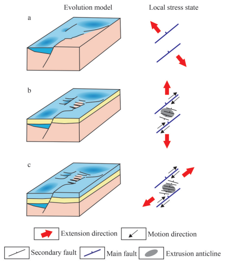 近年来,珠江口盆地油气勘探工作取得了一系列重要突破,其中位于文昌A凹陷的转换带内已发现超过2000万吨的油气量,是过去十年来珠江口盆地西部最大的油气发现。yL23411永利集团李伟副教授团队基于三维地震反射数据对文昌凹陷进行研究,并利用几口深井对数据进行校准处理,确定了文昌凹陷新生代层序中7个关键的地震反射界面,识别并描述出了文昌A凹陷转换带的几何形态,并利用断层活动速率参数确定了转换爱主次级断裂的演化规律,恢复了文昌凹陷新生代的构造演化史(图1),计算得出了不同地质时期不同方向的变形速率,并由此可确定出各地质时期的区域伸展方向和强度。研究结果表明文昌A凹陷南部发育大型合成超覆转换带,转换带南部断裂和6号断裂为其主要断裂,在转换带内及周围发育大量北西向次级断裂,与主断裂几乎垂直或成大角度相交,东向断裂和北西向断裂的共轭交汇区为油气运移和聚集提供了更多的机会。此外,转换带发育受先存断裂与区域应力转换的相互作用控制(图2),在古新世和始新世,主要断裂的不同活动导致了接力斜坡和超覆转换带的形成;进入渐新世至早中新世时期,北东向和北西向的断裂在斜向伸展作用下重新激活,而转换带内的断裂发育主要是通过先存北西向断裂的重新激活来实现的。从中新世中期开始,在北北东向的伸展作用下,北东走向的走滑断裂占主导地位,并建立了低幅度的断裂背斜,其构造演化过程不仅展示了转换带的动态演化史,而且对于理解油气在该区域的分布具有重要意义。