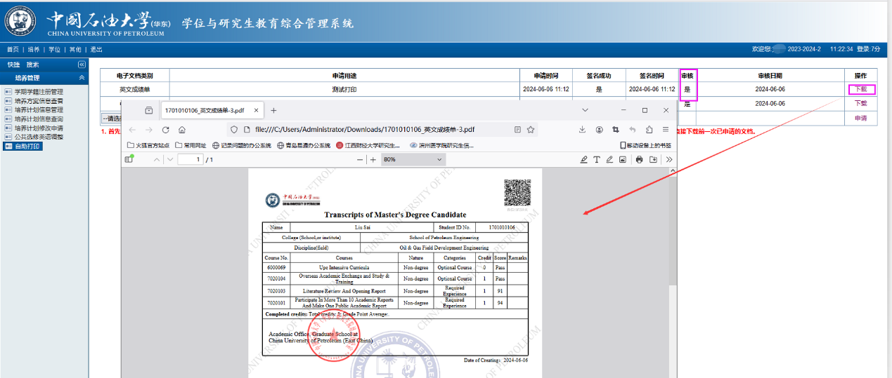 步骤二:审核状态为“是”后,点击“下载”按钮可以导出带有电子签章的成绩单。
