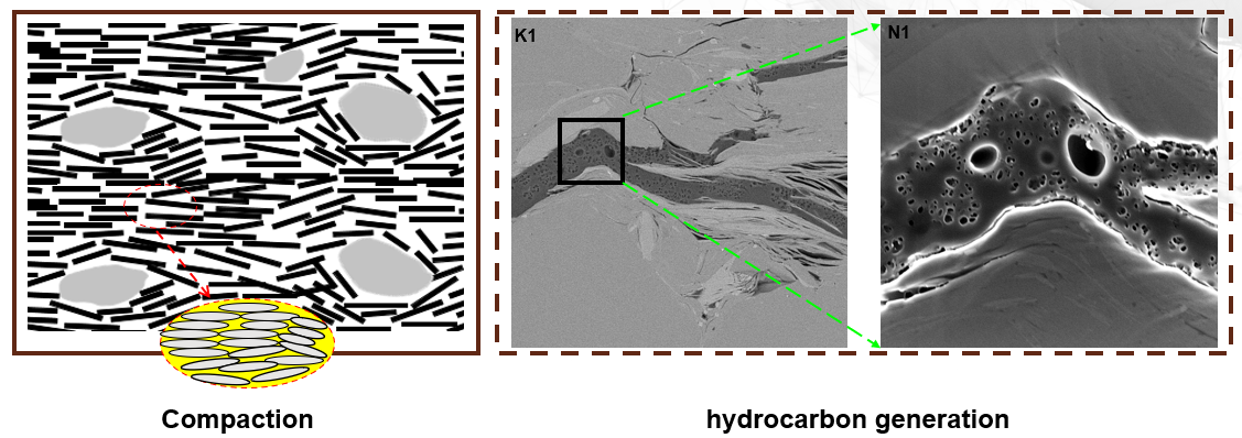 图1.压实作用以及生烃作用对岩石围观结构的影响