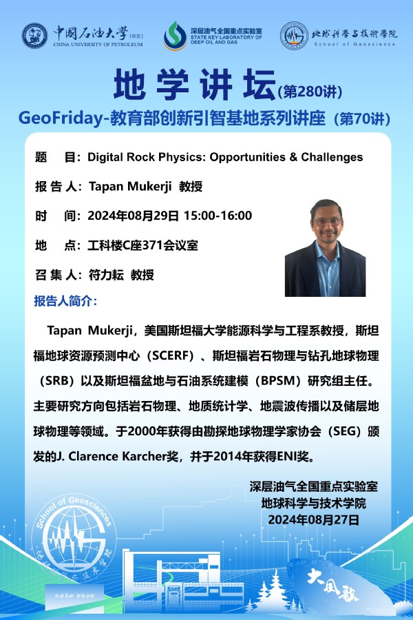 【地学讲坛第280讲】关于Tapan Mukerji教授《Digital Rock Physics: Opportunities & Challenges》学术报告的通知
