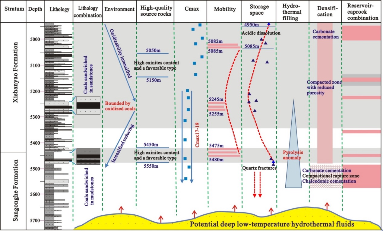 吐哈油田是最早利用煤成烃理论指导勘探开发的含油气盆地,自1989年台参1井在侏罗系获得工业油气流后,目前侏罗系的勘探都集中在环洼带,而洼陷中心的深层仍是勘探空白区域,勘探程度很低。为了探索吐哈盆地下侏罗统煤系地层是否具备近源大面积岩性成藏的地质条件,本研究基于洼陷中心井的系统取芯,开展了薄片鉴定、有机地球化学、X衍射、核磁、CT等多项实验,系统评价了胜北洼陷煤系地层的成藏地质条件及主控因素。综合认为,胜北洼陷中心侏罗系地层发育多套煤系源岩,为多层系的立体成藏提供充足气源;致密砂岩具有物性差、孔隙结构复杂的特点,但深层仍然发育渗透率高值区以及纳米级孔隙的异常带,为深层致密油气的富集提供有利空间;压实作用和晚期碳酸盐的胶结作用是储层致密化的关键因素,在煤系地层流体的溶蚀作用下,致密砂岩储层的微观储集空间和连通性都得到改善。优质储层的发育受烃源岩的控制明显,二者具有源储紧邻、短距离运聚的成藏特点。