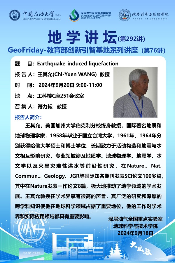 【地学讲坛第292讲】关于王其允(Chi-Yuen WANG) 教授《Earthquake-induced liquefaction》学术报告的通知