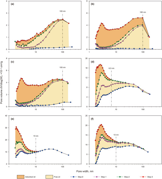 本研究通过有机地球化学和微观孔隙结构表征实验,定量评价了苏北盆地阜宁组页岩页岩基质中油的赋存特征。多等温阶段热解 (MIS) 实验结果表明,页岩中总油、吸附油和游离油的含量分别为 3.15–11.25 mg/g、1.41–4.95 mg/g 和 1.74–6.51 mg/g。其中富硅页岩含油性最好。游离油的相对含量在孔径大于 3 nm 的孔隙中呈增加趋势。当游离油的相对含量达到 100% 时,富硅页岩的孔径约为 200 nm,而富钙页岩、富粘土页岩和硅质混合页岩的孔径约为 10 nm。吸附油的出现规律与游离油的出现规律相反,这表明页岩油在更广泛的孔径范围 (>200 nm) 内会以游离状态出现在孔隙和裂缝中。