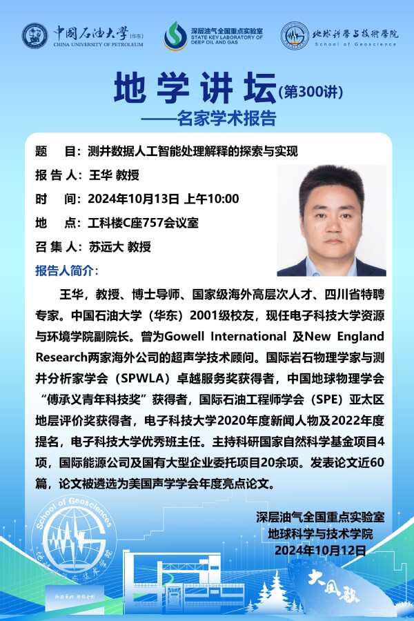 【地学讲坛第300讲】关于王华教授《测井数据人工智能处理解释的探索与实现》学术报告的通知