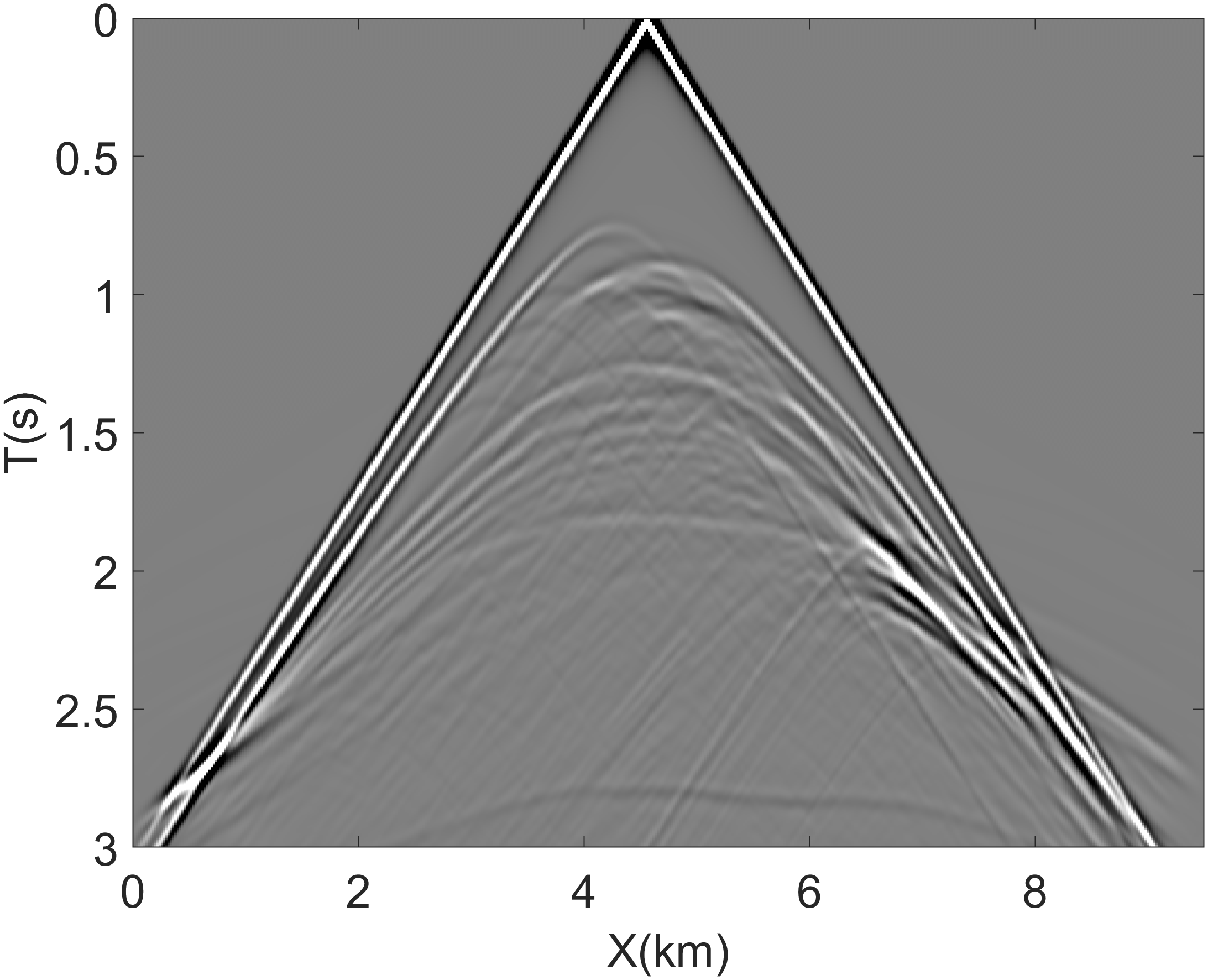 图2.(a)声波方程和(b)基于CQ的粘声波方程进行正演模拟的炮记录
