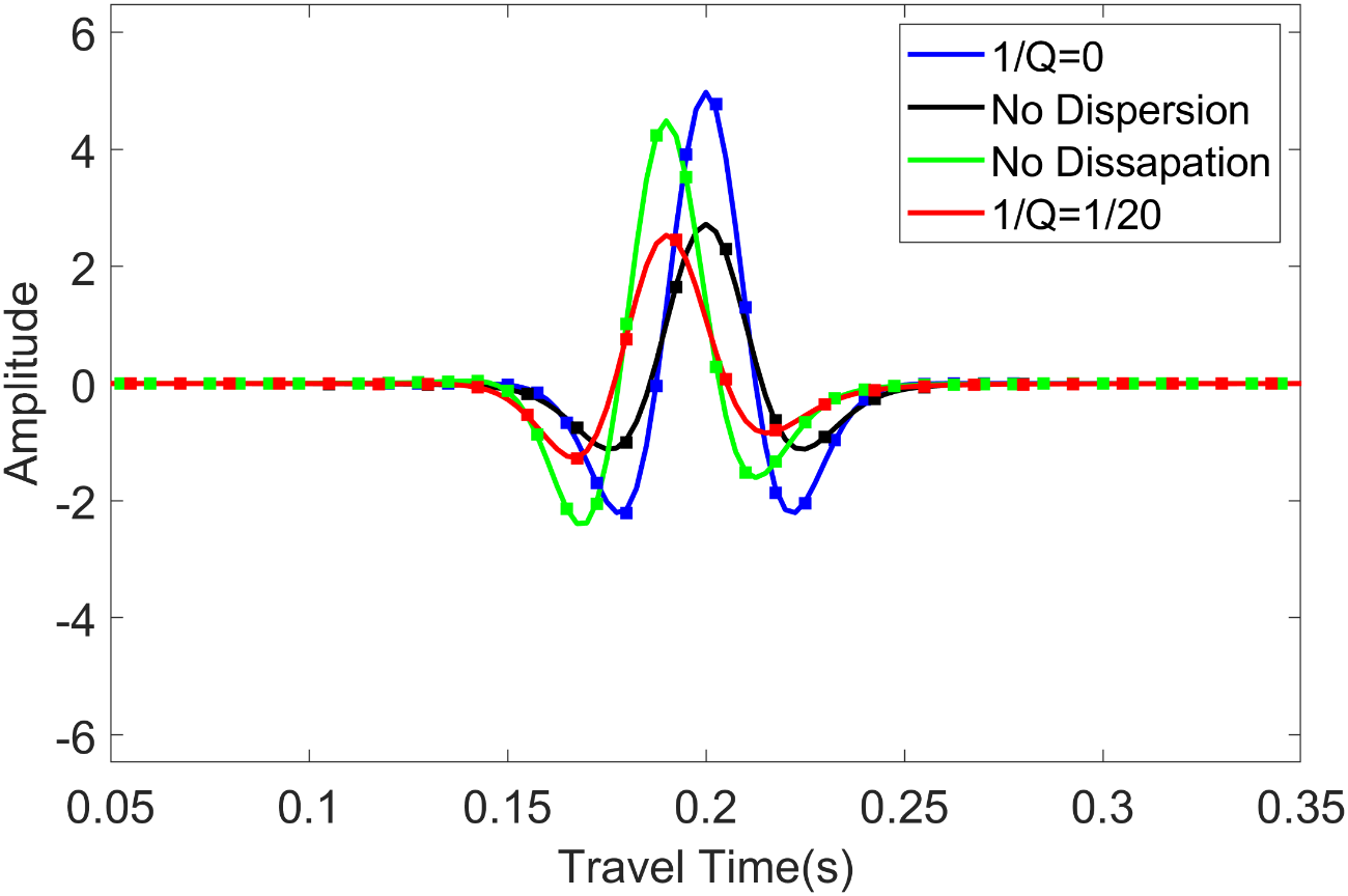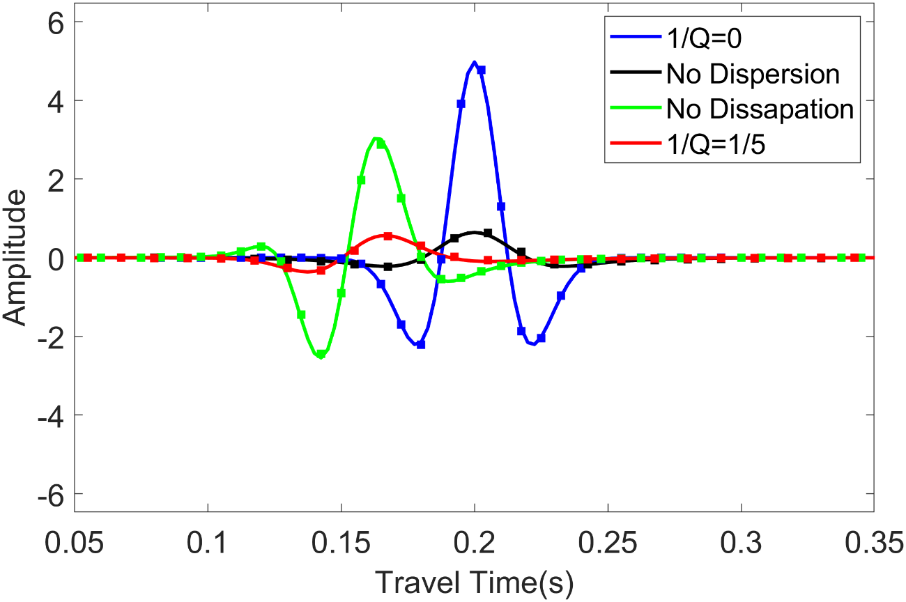 图1.(a)强衰减(Q=5)和(b)弱衰减(Q=20)介质的数值和解析解的比较,其中1/Q=0表示无吸收的介质。图中解析解用实线表示,数值解用虚线表示,包括声波方程(蓝色)、仅频散(绿色)、仅衰减(黑色)、频散和衰减相结合(红色)方程